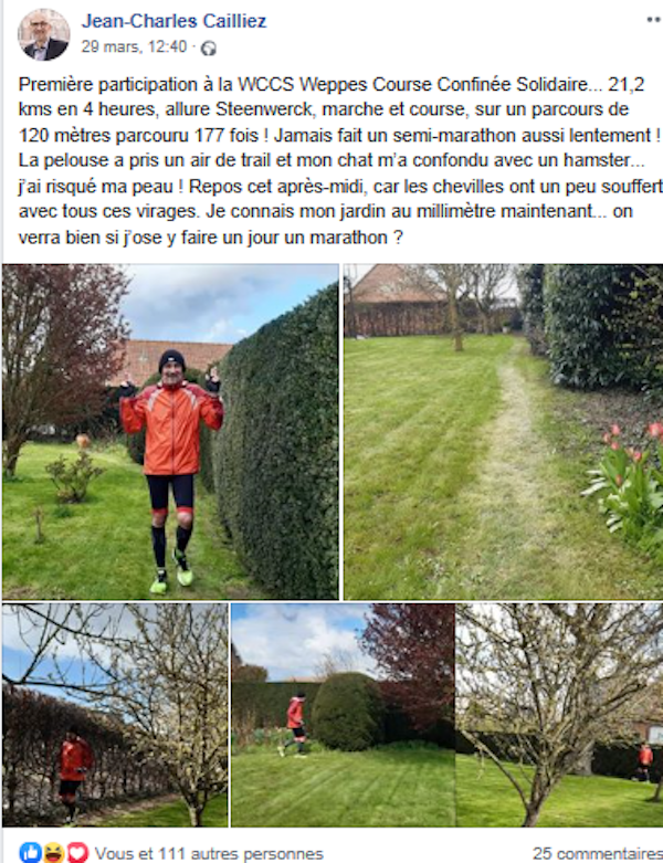 « À l’annonce du confinement, on a l’idée de faire la course ensemble en étant connectés : à plusieurs, au même moment mais chacun chez soi. On a fait d’abord une course, on était 80 ». C’était la première édition de la « course confinée solidaire des jardins et balcons des Weppes » qui était partagée en direct sur Facebook.
