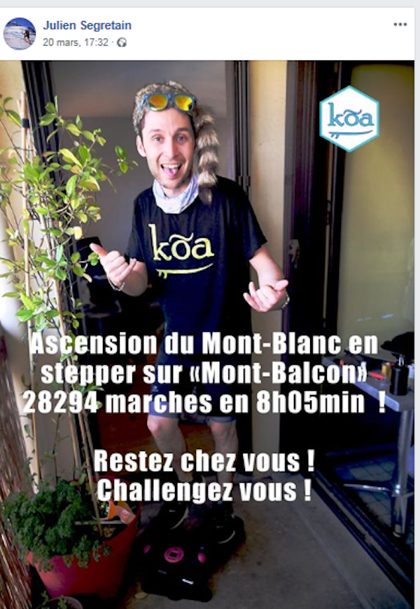 « Ce confinement il ne faut pas le voir comme une punition en soi. Il faut trouver des alternatives. Quand j’ai vu que de nombreux sportifs ne respectaient pas ce confinement, j’ai voulu porter ce message : restez chez vous ! Moi aussi je suis un hyperactif du sport et c’est possible de trouver des bons moments ». Julien se lance alors dans l’ascension du « Mont Balcon », l’équivalent des 4 810 mètres du Mont Blanc, en 8h et 28 294 marches… sur un stepper trouvé dans un placard et installé sur son balcon.