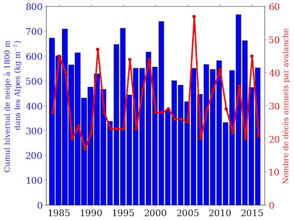 Alors même que l’imaginaire collectif associe généralement avalanches et abondance de neige, il n’y a en fait pas de relation statistique avérée entre les quantités de neige tombées en montagne pendant un hiver donné et le nombre de décès par avalanche.