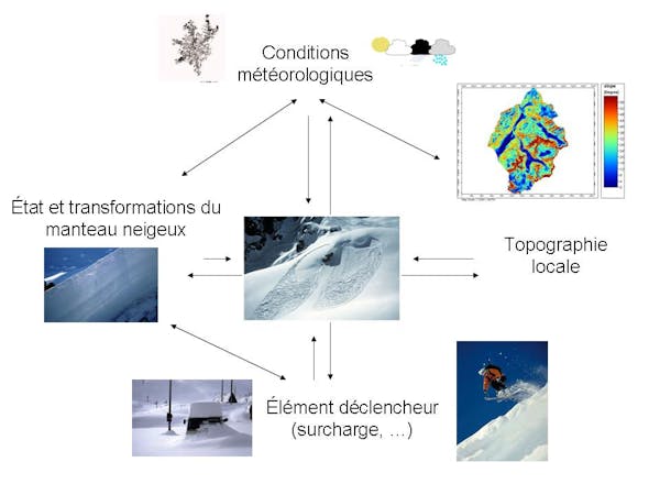 L’élément déclencheur provoque une perte d’équilibre locale du manteau neigeux (appelée « initiation ») qui se propage à un volume important de neige instable (appelée « propagation »). Cet équilibre instable est lié à la présence d’une pente assez forte dans la zone de départ et d’une configuration particulière des propriétés physiques des couches de neige. Ces propriétés physiques et leur évolution sont déterminées par les conditions météorologiques et la topographie locale. La survenue d’une avalanche résulte donc de la combinaison de nombreux facteurs.